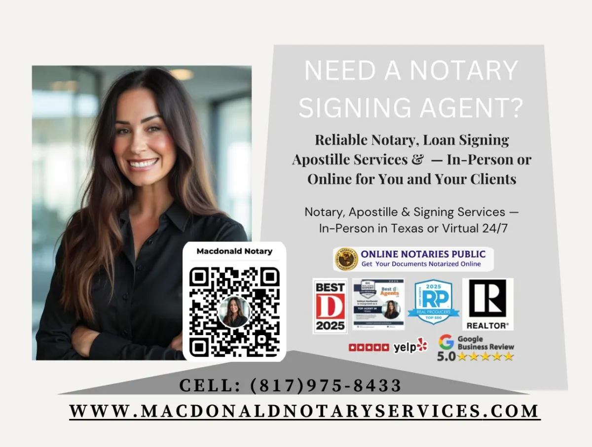 Today, I proudly serve the entire Dallas-Fort Worth Metroplex and all of Texas, offering mobile and online notarizations tailored to your needs.